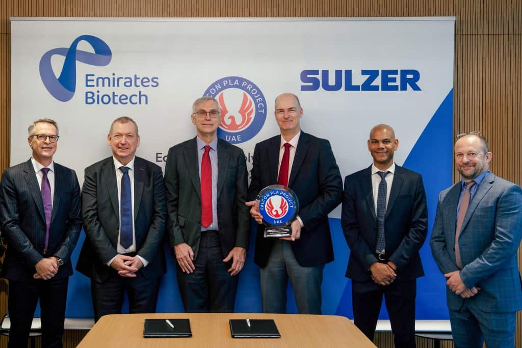 This strategic milestone confirms Emirates Biotech’s transition from early planning to active project execution for the project named Falcon PLA Project. Sulzer will manufacture and supply the essential proprietary equipment for the integrated PLA production process from lactic acid, which includes lactide formation, purification and polymerization technology.